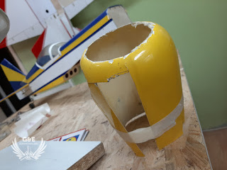Najgore, da kad sam pitao vlasnika za stanje, nešto nije pominjao ovaj "mali" nedostatak No, i ja sam napravio grešku, nisam tražio detaljne fotke da bih video šta se nalazi ispod kapotaža. Ako smo kod kapotaža, i tu je bilo posla. Pre je model leteo sa glow motorem, pa je otvor jako velik. Ako pogledate preciznost sečenja, kao da su sekli sa sekirom
